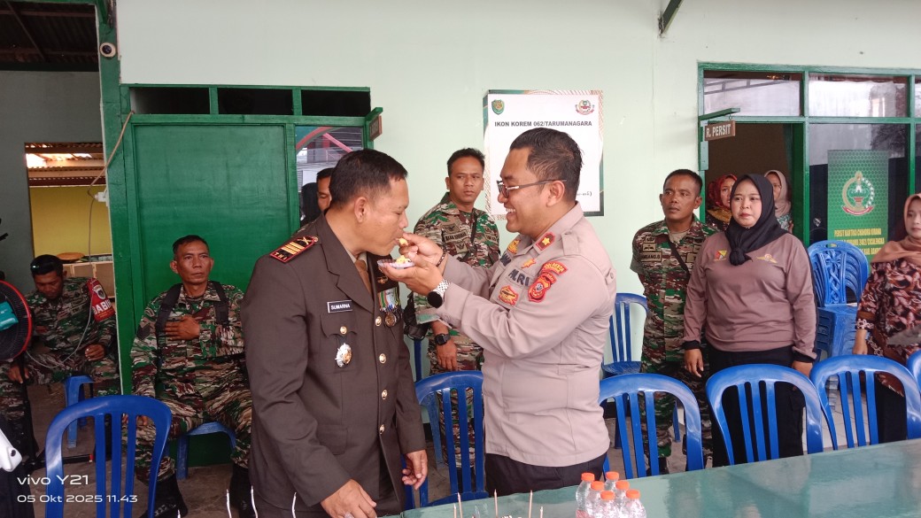 Jawa Barat || pewartanaaional.com || Dalam rangka memperingati Hari Ulang Tahun (HUT) Tentara Nasional Indonesia (TNI) yang ke-80, Polsek Nagreg menunjukkan wujud nyata sinergitas dengan mengirimkan kue ulang tahun dan ucapan selamat kepada jajaran TNI di wilayah Koramil 2402/Cicalengka, Minggu 5/10/2025